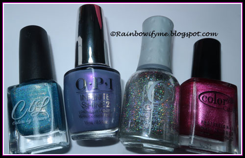 Turq'd; OPI: Love Or Lust-Er; Orly: Shine On Crazy Diamond; Color Club: Hot Like Lava |